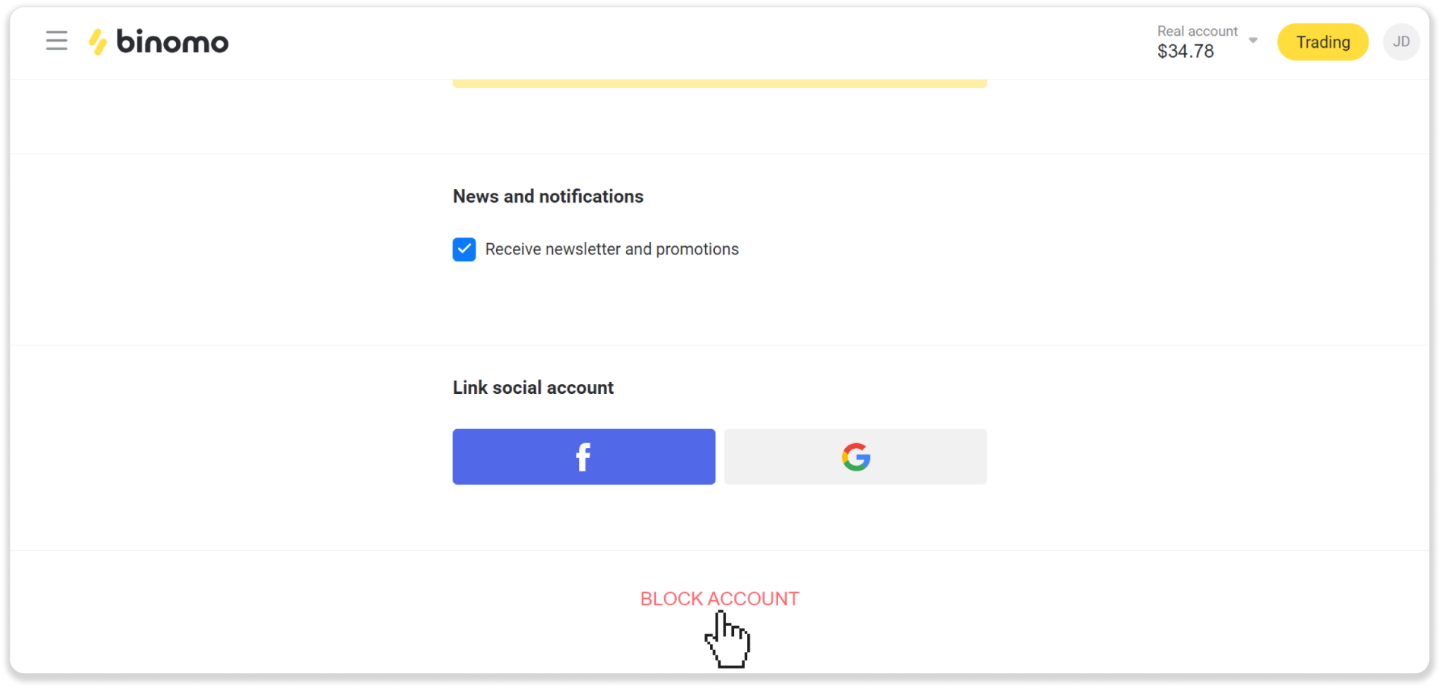 - Нажмите «Заблокировать счет» внизу страницы.