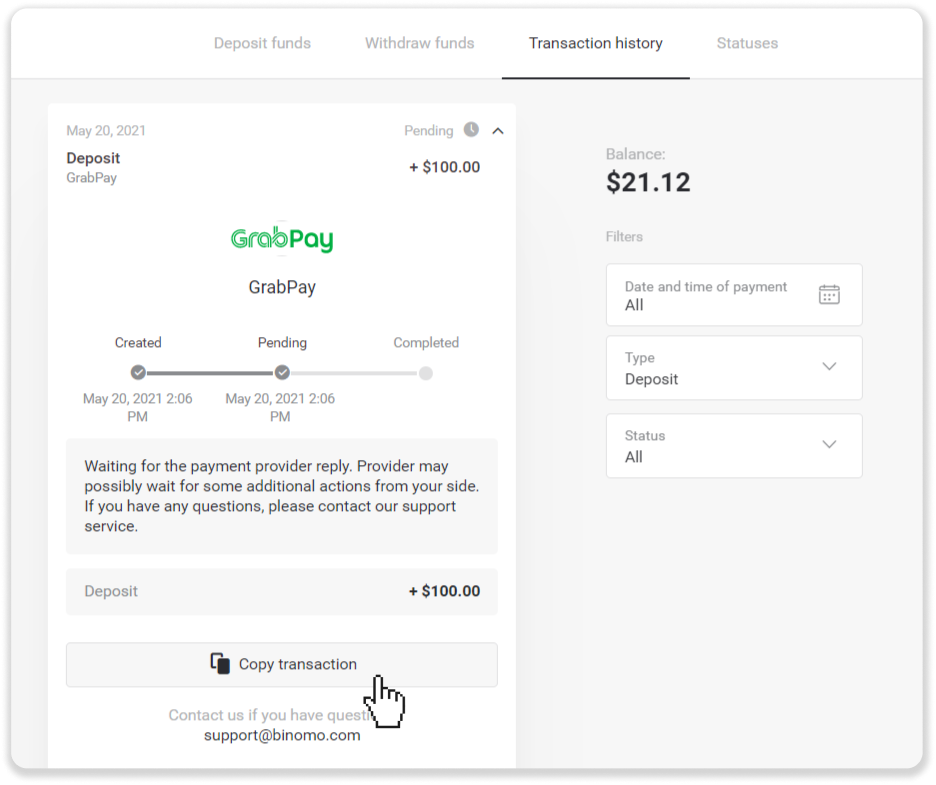 4. Tüm bilgiler doğruysa, ancak yine de fonlarınızı aktaramıyorsanız veya reddetme nedeni belirtilmemişse, bizimle support@binomo.com adresinden veya canlı sohbet aracılığıyla iletişime geçin. Bu sorunu çözmenize yardımcı olacağız.