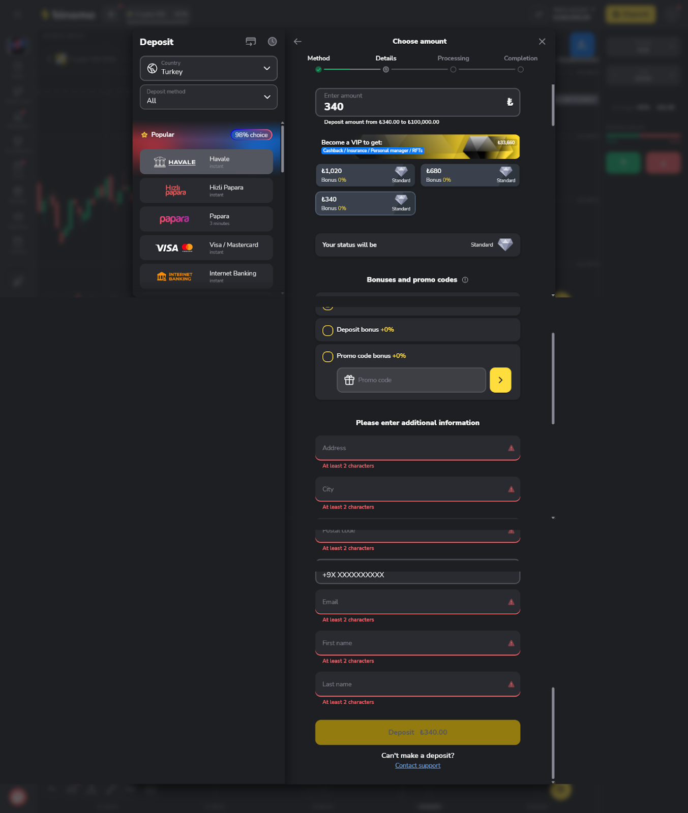 Tüm ödüllerin doğru şekilde işlenmesini sağlamak için, işleminizi tamamlamadan önce tutarı her zaman tekrar kontrol edin. Yanlış para yatırma işlemleri, promosyon bonusları ve ödüllerinden yararlanma hakkınızı kaybetmenize neden olabilir.