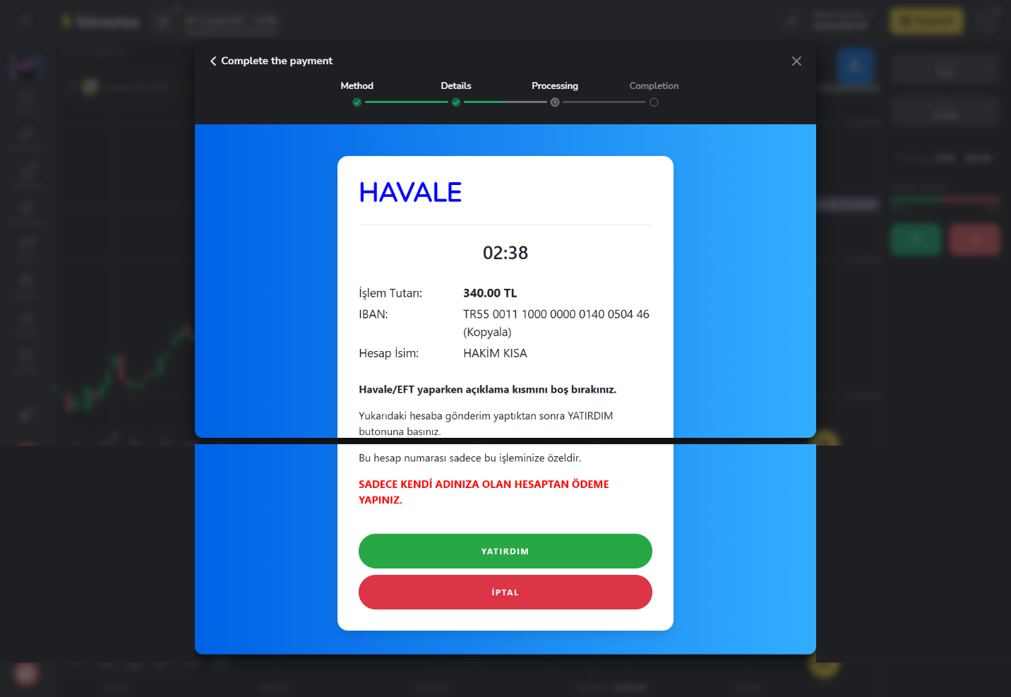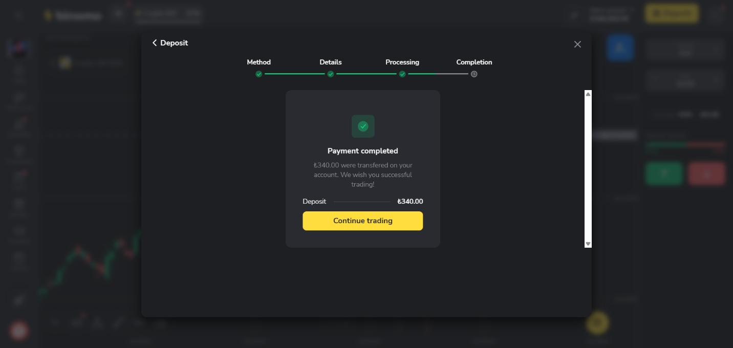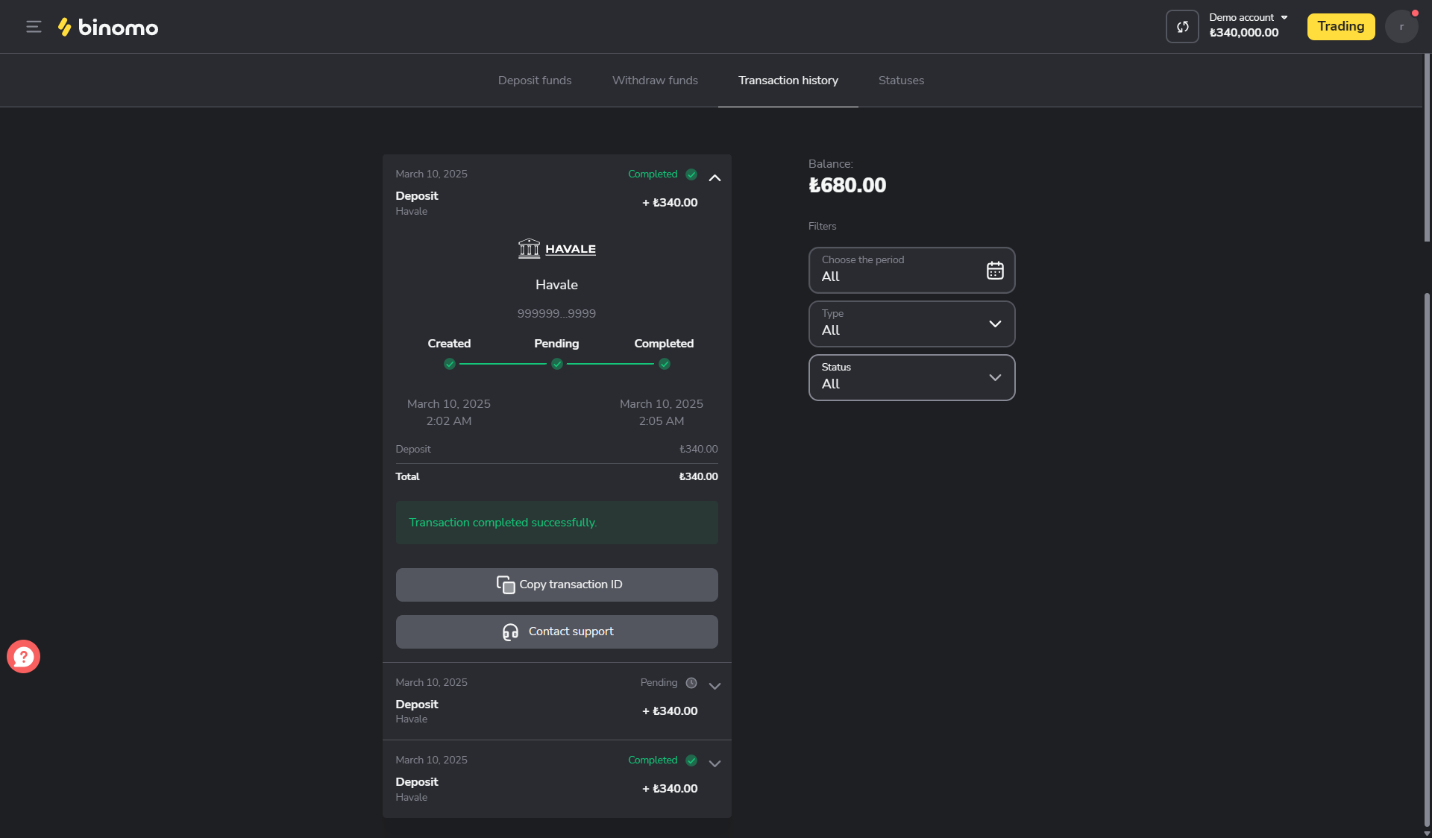 Not: Ödemenin Binomo hesabınıza geçmesi biraz zaman alabilir.
