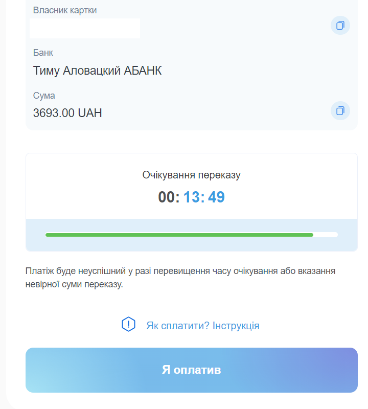 3. Вас буде перенаправлено у інтерфейс p2p. Послідуйте інструкціям та натисніть кнопку «Оплатити» - зауважте, що сплатити потрібно вчасно. Інструкцію можна переглянути ще раз, натиснувши на кнопку "Як сплатити? Інструкція".