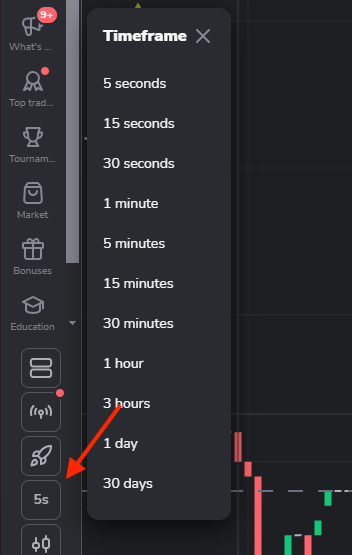 - "کینڈل" اور "بار" چارٹس کے لیے – کم از کم فریم 5 سیکنڈ، زیادہ سے زیادہ 30 دن۔ یہ وہ مدت دکھاتا ہے جس کے دوران 1 کینڈل یا 1 بار بنتا ہے۔