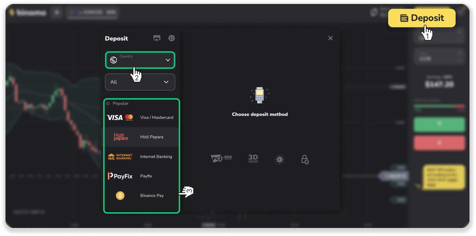 - Trong phòng giao dịch, nhấp vào nút “Nạp tiền” ở góc trên bên phải của màn hình. Chọn quốc gia của bạn và phương thức thanh toán bạn đã quyết định sử dụng để nạp tiền.